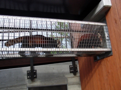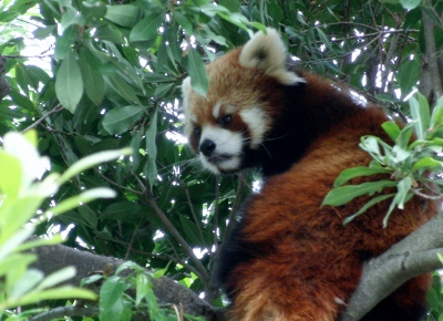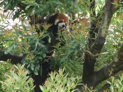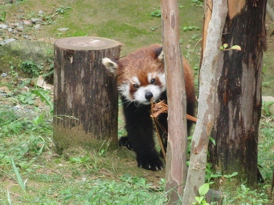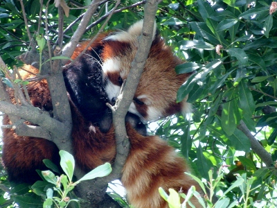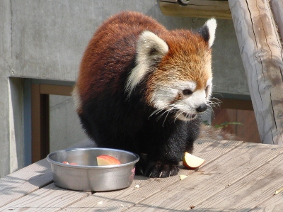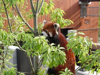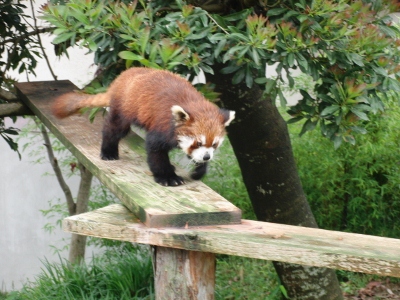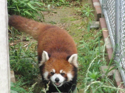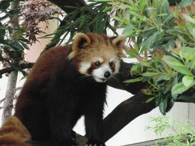 ここのチンパンジー舎は「西鉄」から北九州市の市立動物園にかわった際に新たに作られ、チンパンジー達も新たに連れてこられた子達で構成されているらしい(汗) なにぶん近くに住んでいながらオー兄ちゃんやチー兄ちゃんが小さな頃に行ったきりで、ずっとご無沙汰だったもので・・・。 一度廃園になりかけ(なったのかも)、市が運営を継続することになり・・。 きっとこじんまりとなったり、寂れているんだろうな~等と思ってきたら・・・大違い。 賑わっている~!!ゴールデンウィークだからか?? 園舎がいたるところ新しく見やすくなってる~!! 特にレッサーパンダ舎! 綺麗で快適そう。 お爺さんレッサーが2匹とそれから若いリンリン君と野風ちゃん。 来年くらいに赤ちゃんパンダが誕生~♪なんてことになったら素敵! 円山のココちゃんとセイタ君は喧嘩ばかりで繁殖期以外は同居できないのだけれど、この2匹はなんだかとても仲良し。 野風ちゃんの後をず~っとついてまわるリンリン君。 くっついて昼寝したりしてるし・・・。 多分、上の一匹で写っている子はリンリン君?? そしてこの子が野風ちゃんだよね。 この子達のこれからがかなり気になります♪
