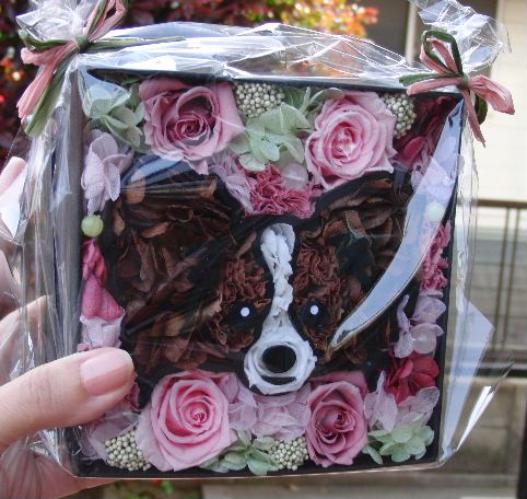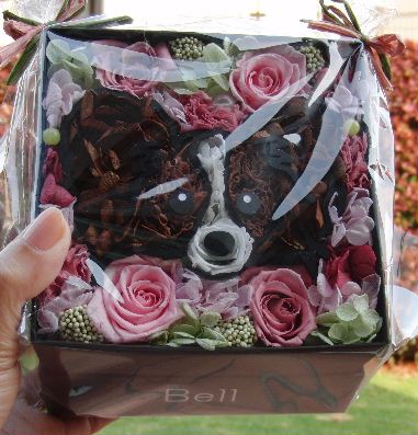 なのに、 また更に記念日が重なることに・・・。 お~兄ちゃんの結婚式がこの日にあったのです。 若い二人が全て自分達で計画し取り仕切ったので 私たち親はまるでゲストのように参加すればいいだけで 大いに楽しむ事ができました。 とても素敵な式でしたよ~♪ お~兄ちゃんが幼稚園時代からの友達や 高校時代のサッカー仲間! 何度もうちに泊まりにきたりしていたあの子達がこんなに大きくなって~~、 もとい、立派になって~(ノ_<。)うっうっうっ めちゃ感動しちゃいました。 カメラ係のチ~兄ちゃんが懐かしい高校時代の仲間を撮ってくれていました。 みんな「たっくん?」って言いながら大笑いしてました。そりゃあ小学生だったあのちびんこがスーツ着てるんだものね~!(* ̄m ̄) 右の半分は大学時代の友人達。マリリンを連れて行った卒業式で会った懐かしいメンバー。 こうやって仲の良かった息子の友達の成長した姿が見れるなんて Bellパパといたく感動しておりました。 本当に良かった~(*^o^*) ただ、問題だったのはワンコ達。 レミーがいるので事故などあってはいけないのでもう友人とかに頼む事もできず、 一泊の30時間ほどの長時間もの初めての留守番をさせました。 Bellだけリビングを自由にさせて、あとの子達はそれぞれゲージに入れて! うちはいつもは庭でトイレをするのだけれど、メスだけは幼い頃の躾を忘れずにいてくれてトイレシートで用を足す事ができます。 帰ってきたらBellはリビングに置いたトイレシートにおチッコをしており、もう一度は台所マットの上にしていた。大のほうはトイレシートの近くにやっていた(涙) (この子は汚れたトイレシートには乗らないのだ) ペコとクレアはトイレシートにきちんとできており、ただ天馬がベッドの横に水溜りを作っていた。 他のオス達はなんと30時間もの間我慢できていた\(◎o◎)/ すんごく心配したけれど、ちょっとおもらしがあっただけで無事にこの日を乗越えられて一安心。 最後に、 なんとこれが新郎新婦からのプレゼント。 両家に プリザーブドフラワーで作ったそれぞれのペットにそっくりな飾り物! 名前入りです♪ そっくりでしょう~?